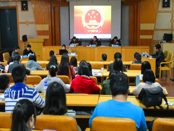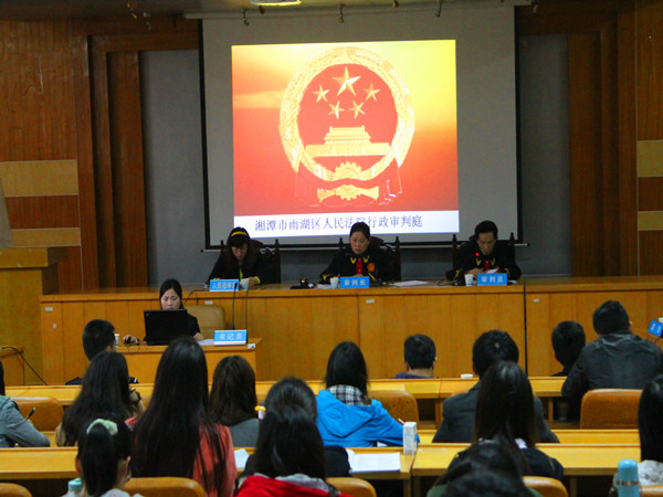 | 4 月24日 上午九点,湖南省湘潭市雨湖区法院行政审判庭在我校五教2—4进行行政诉讼案件的开庭审理,巨乳