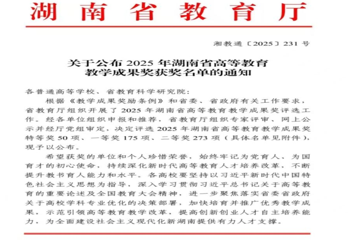 近日,湖南省教育厅正式公布2025年全省高等教育教学成果奖获奖名单,巨乳